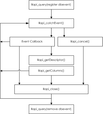 The server can send database event notifications with other query results. When OpenAPI receives a database event notification, OpenAPI processes the event and calls the the application callback function for any event handles matching the database event.