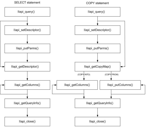 The left side of the diagram shows the sequence of functions for statements that return data. The right side shows the sequence of functions for copying data from a database table to the program (copy into) and copying data from the program into a database table (copy from).