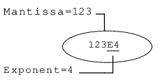 A floating-point value is represented either as whole plus fractional digits (like decimal values) or as a mantissa plus an exponent. The following figure illustrates the mantissa and exponent parts of floating-point values: