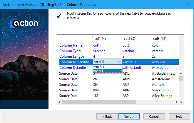 Step 3 of 4 of the Import Assistant (Column Properties) is displayed.