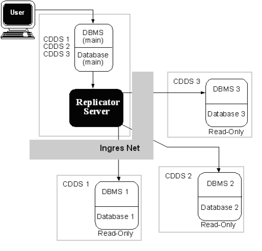 In a central-to-branch scheme, illustrated in the following figure, subsets of a central database are designated for replication to branch sites. The diagram shows read-only targets, but central-to-branch is often combined with peer-to-peer. In this arrangement, branches can update information from headquarters or create their own data and send the new data back to headquarters.