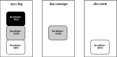 The R.E.P. company is partitioning its warehouse information: the New York location must contain information for all warehouses, and the San Francisco and London locations must only contain information for their respective sites. This example is also discussed in