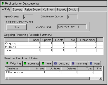 To monitor replication activity for all running servers, view the Performance Monitor Activity page when a database is selected. The Activity page shows the total number of outgoing and incoming records, the total number of transactions associated with the incoming and outgoing records, and the queue activity for each database that the servers support.