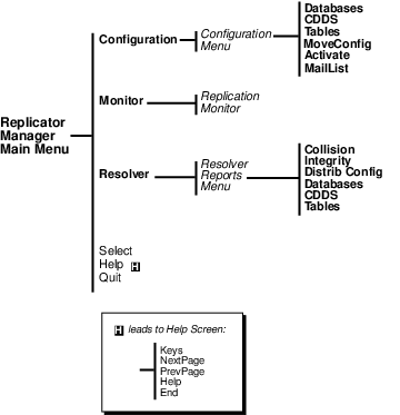 The following map shows each selection that is accessible from the Replicator Manager main menu.