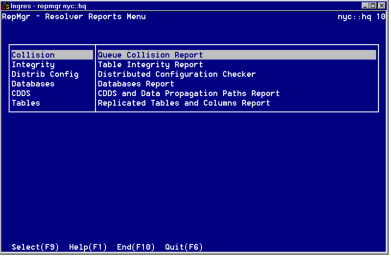 The Resolver Reports Menu appears when you select the Resolver option on the Replicator Manager main menu. From this window you can choose reports, which are useful as tools to maintain the consistency and integrity of your replicated databases.