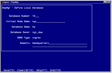 2. Enter appropriate values from your Database Worksheet in the Database Number, Virtual Node Name, and Remarks fields (use the tab key to move from one field to the next), and choose Save.