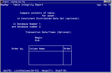 The Table Integrity Report window appears when you select the Integrity option from the Resolver Reports Menu window. This window allows you to define a report that compares a table in the local database against the same table in a different database.