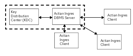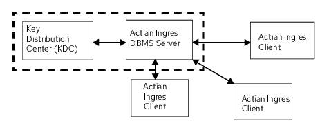 The example above demonstrates why Kerberos is sometimes referred to as “distributed authentication.” The KDC performs authentication for all Actian Ingres nodes in the enterprise, even though the KDC itself resides on a separate network node.