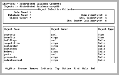 The ListObj operation displays the Distributed Database Contents frame, which lists the component objects of the distributed database and the system catalogs: