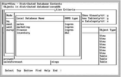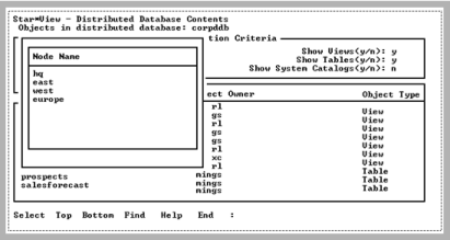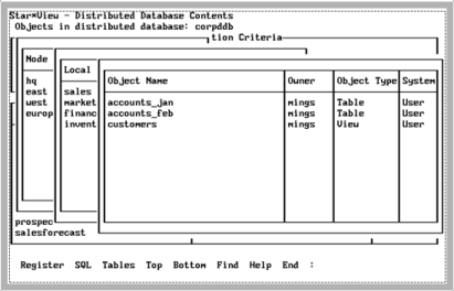 To see all the components of a distributed database, use the Browse operation. You can view the component nodes, the databases on that node, and finally the objects such as tables and views within any of those databases. When the objects within a local database are displayed, you can register them in your distributed database.