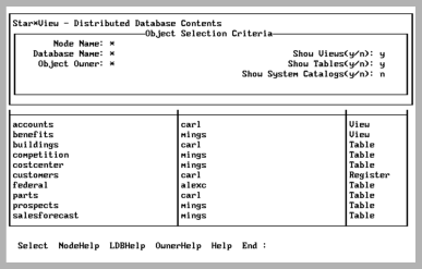 You can restrict or extend the display of the objects in your distributed database with the Criteria operation. For example, if you change the Show System Catalogs to y, system catalogs are also displayed.
