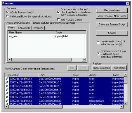 Initially, the row changes that you selected in the Journal Analyzer are displayed in the lower portion of the Recover dialog.
