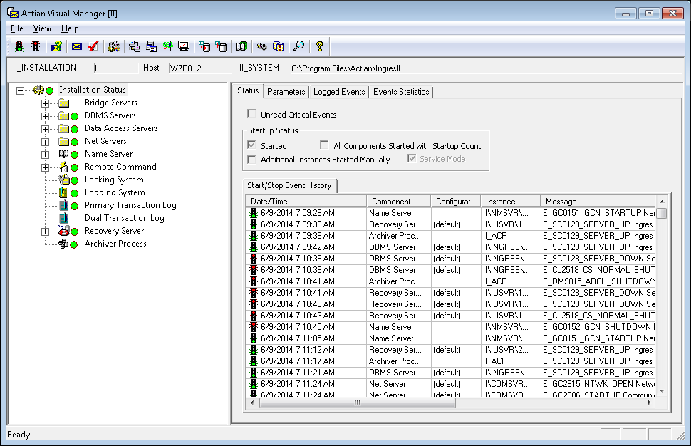 Displays a list of logged events for the Actian Ingres installation and any of its sub-branches. You can also select an event to view its corresponding message text.