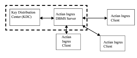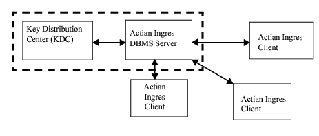 The example above demonstrates why Kerberos is sometimes referred to as “distributed authentication.” The KDC performs authentication for all Actian Ingres nodes in the enterprise, even though the KDC itself resides on a separate network node.