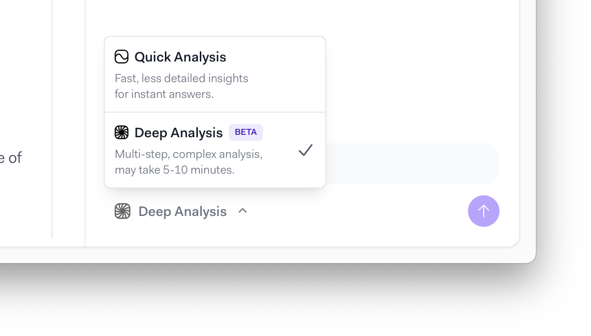 Deep Analysis is an advanced research mode that creates comprehensive reports for complex business questions. Unlike Quick Analysis, which provides immediate single-turn answers, Deep Analysis creates a research plan and executes multiple targeted analyses to deliver thorough insights.