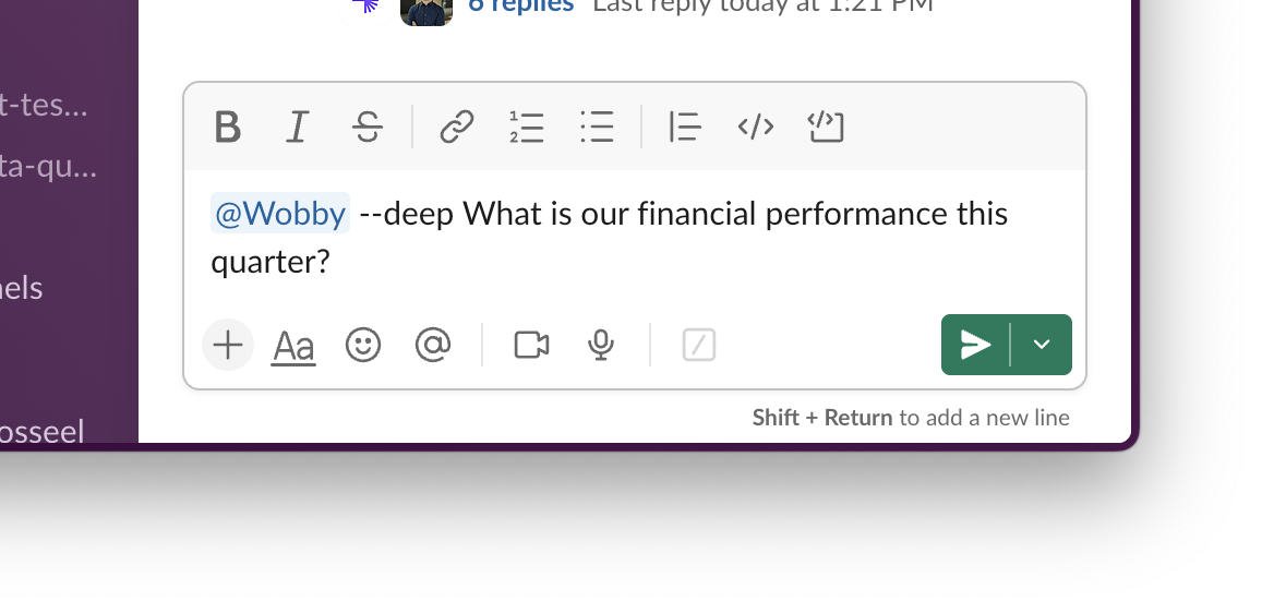 You can easily switch between Deep Analysis and Quick Analysis by selecting it when sending a message to Actian AI Analyst. If you are using Actian AI Analyst in Slack, you can trigger Deep Research by adding --deep to your query.