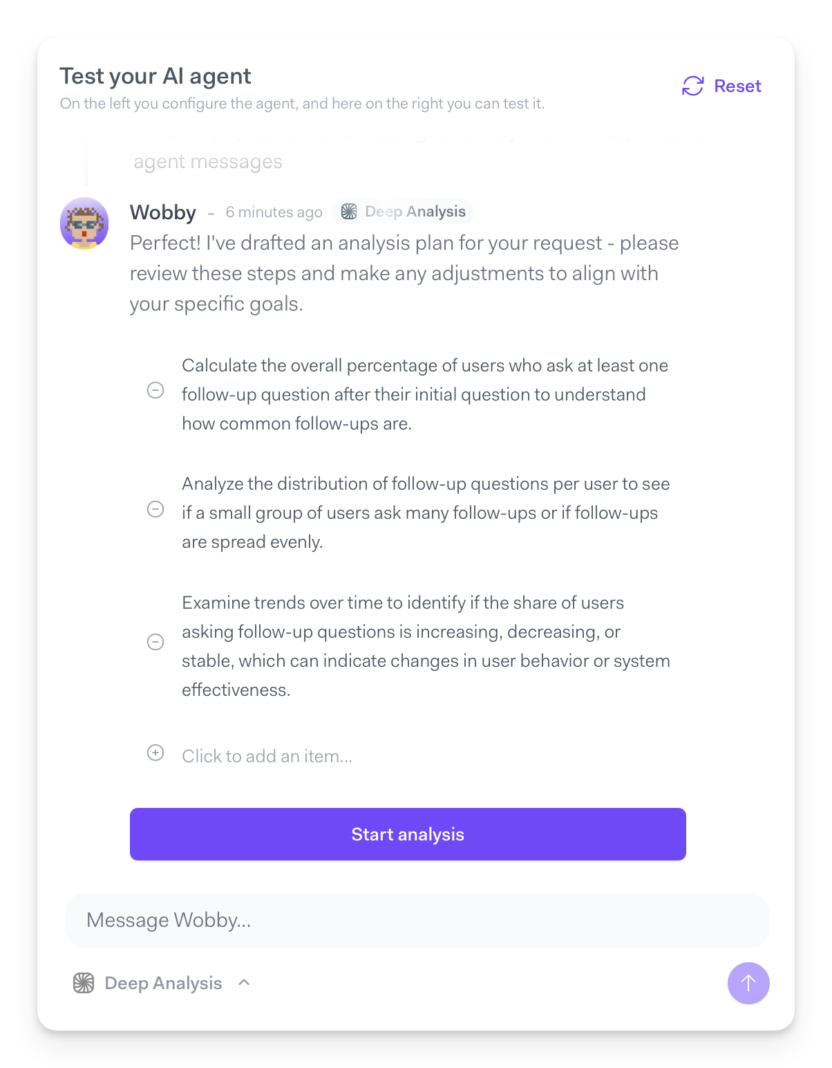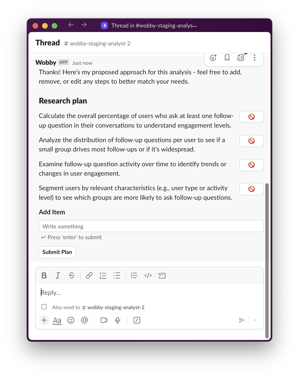 After processing your query, the agent will draft a plan, which you can adjust by either deleting items from it, or adding new ones.