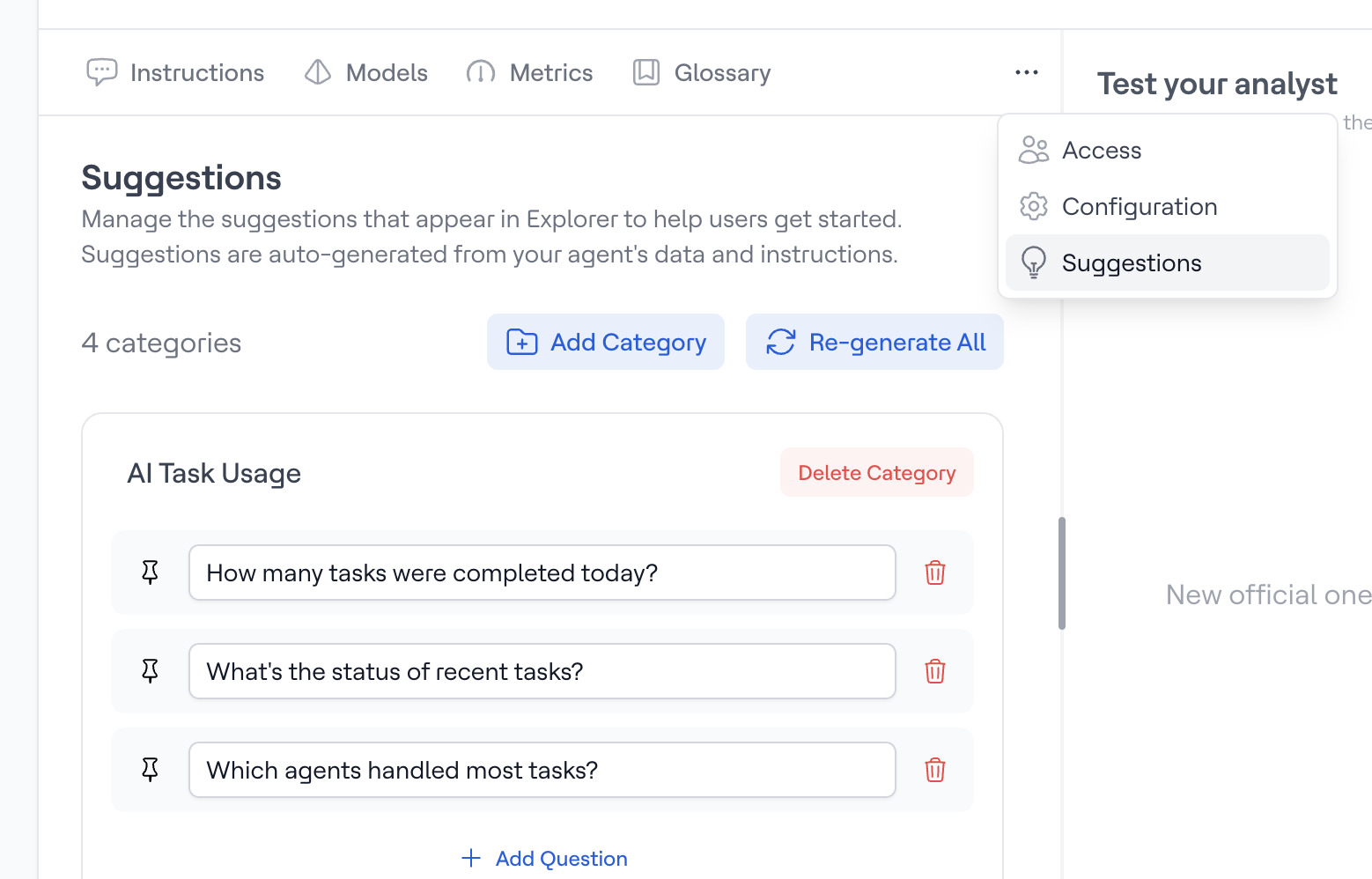 Actian AI Analyst can automatically generate suggestions based on your agent's connected data and instructions: