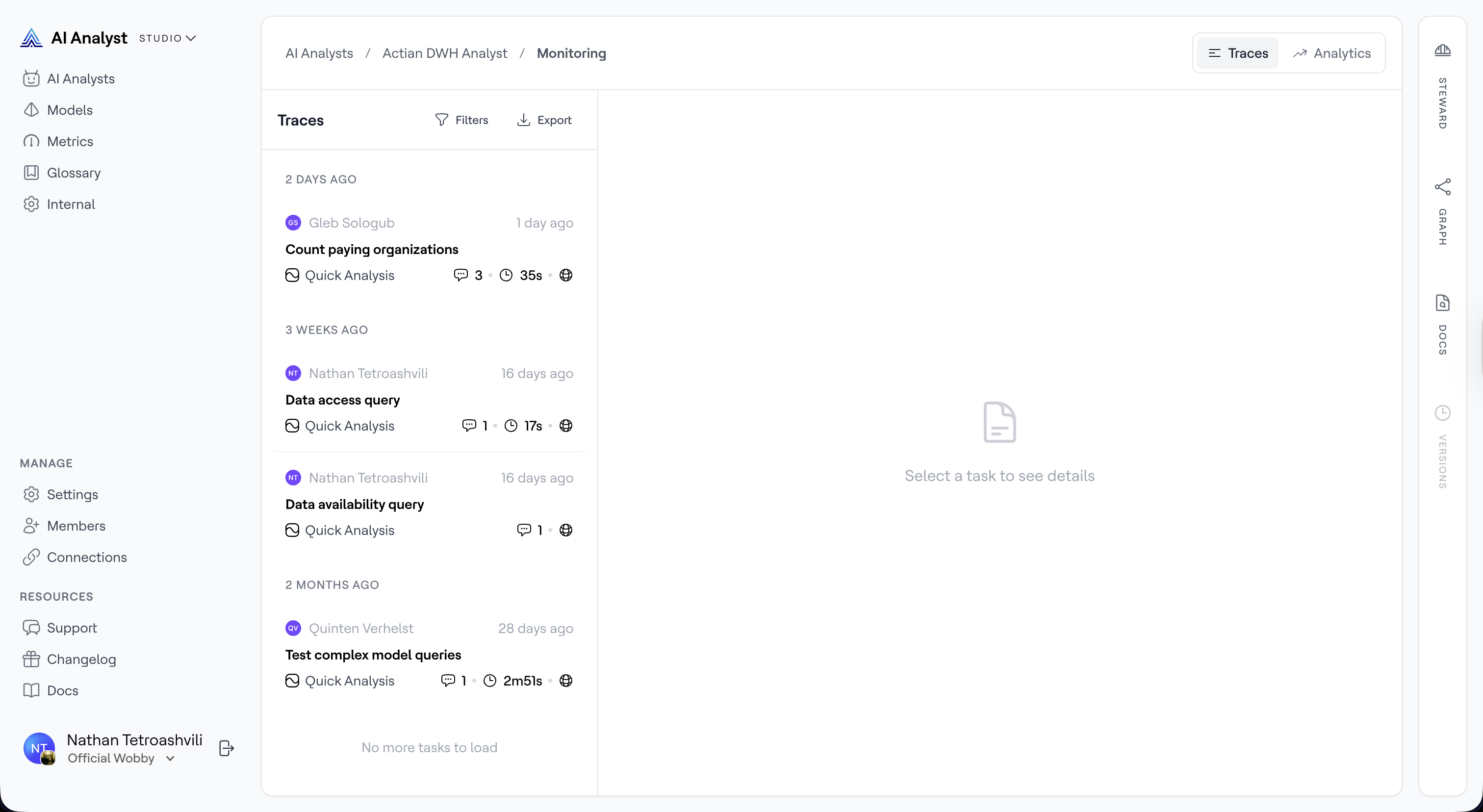 In Studio, the Traces tab gives Admins a full log of every conversation that has taken place with an AI Analyst. Each conversation — from a user asking a question to the analyst returning an answer — is recorded as a single trace. You can browse, filter, and open any trace to replay the full conversation.