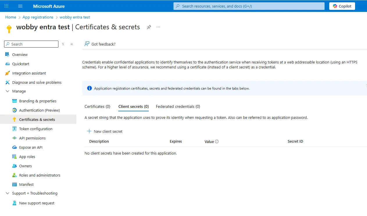 - In your app registration, go to Certificates & secrets.