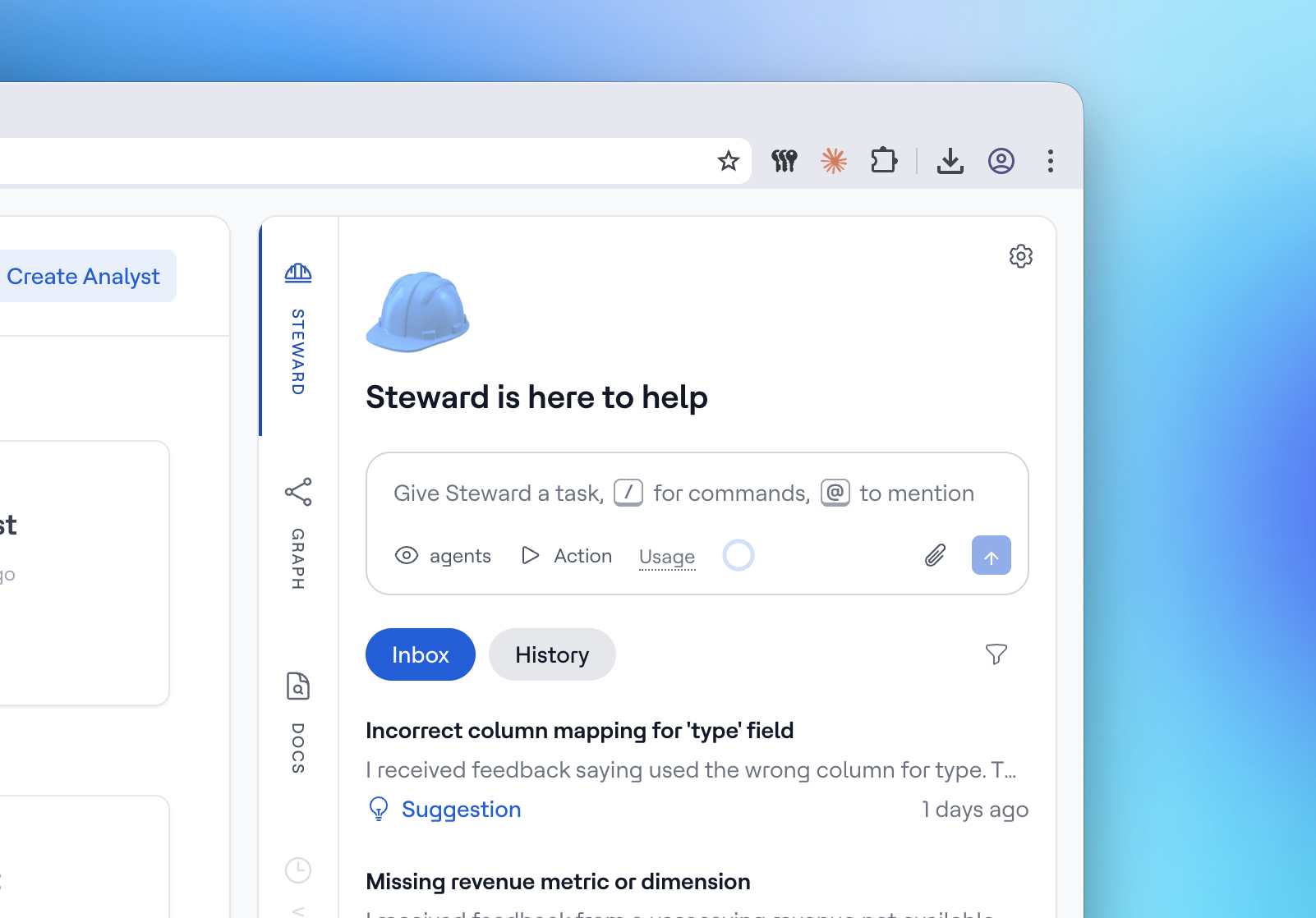 Periodically, Steward scans your semantic layer and reviews what your AI Analysts have been working through. It looks at where analysts struggled, what users asked about, and how well your semantic layer is serving the questions being asked. When it finds something worth addressing, it creates an inbox item with context and a proposed plan.
