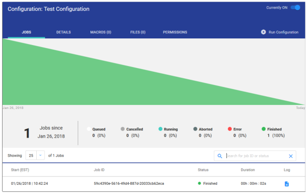 To check the configuration log, click the icon at the far right on the line, under the Log column. This displays metrics about the job and the generated log file.