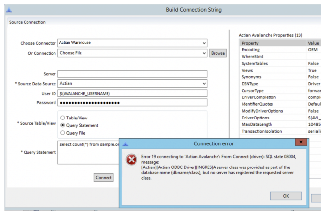 Some connection dialogs, for example, the DJImport wizard may show the following Error 19 when trying to test the connection. Ignore this error and finish the dialog with the shown settings without specifying a DSN. When the connection is used later it will work, locally and when deployed.