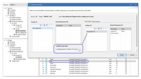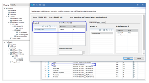 For example, calling the user-defined function shows how to use the Condition Expression to validate zip codes. If the expression resolves to True, then the OutputRecord action is called and the field mappings for Target 1 are used.