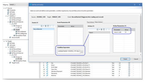 This is one example of effectively using the Event Condition Action rules to perform data validation and reject source data that otherwise requires some remediation. In this case, a literal string is hard-coded in the target field expression to indicate the problem but you can use any pre-defined function, script, or external code to fix the problem in an automated fashion.