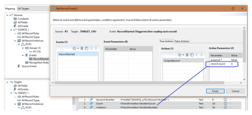 Some built-in features allow you to easily handle multiple operations of the same action. The Record Count action parameter of an OutputRecord operation supports an integer value if you already know the number of times you want to perform the operation. You can use any expression that resolves to an integer as the value. A commonly used technique is to parse a source field into multiple values and write a target record for each. Others include using the size property of any object, the length of an array, or the CharCount function. However, in this example, the value 3 is hard coded assuming three target records are required for every one source record.