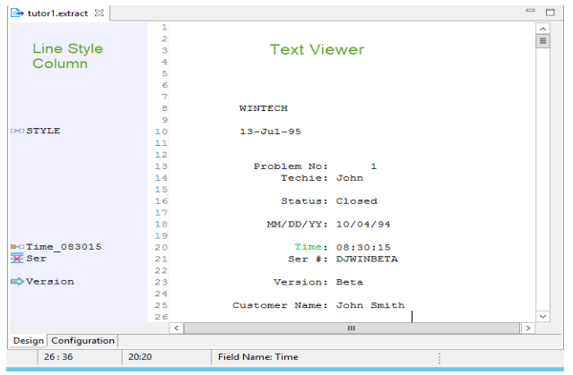 • Text Viewer: The right side of the Design tab displays the content from the report file. It is read-only. Fields with fixed start and end columns are highlighted in the Text Viewer.