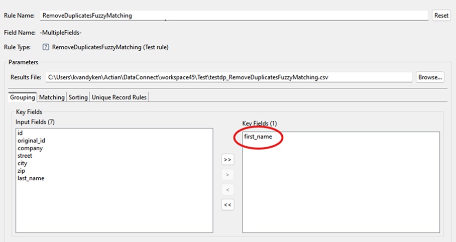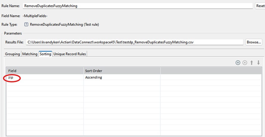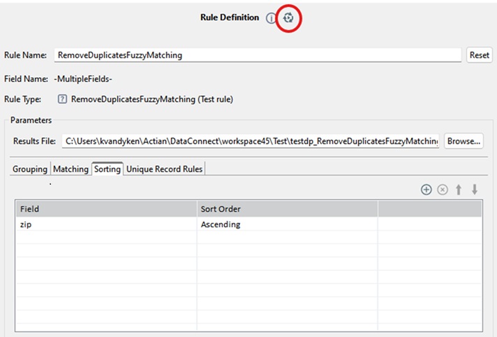 Results File | Browse and select a csv file (only csv files are supported) or specify the path and name of a csv file that will be used as the cluster file. You can use macros for filenames. When the profile is executed, you can browse the cluster file in the Cluster Data tab by selecting the Remove Duplicates rule and clicking |