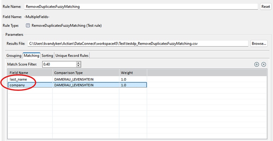 Rule Name | A default rule name (RemoveDuplicatesFuzzyMatching) is provided and displayed here. However, you can edit or overwrite it. Click Reset to restore the default rule name. Note: The underscore (_) character is the only special character allowed in the name. Rule names cannot begin with a digit. If a field or column in the source data starts with a digit, 'r_' will be prepended to any rules created based on that field. |