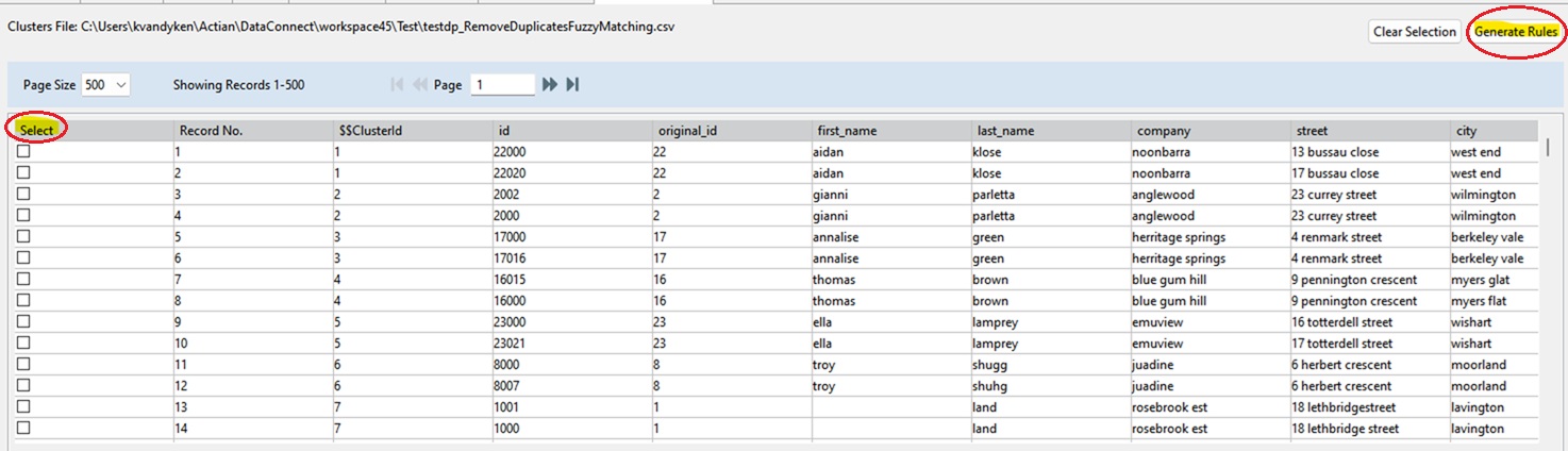 Select | This checkbox allows you to select records manually. By selecting the desired records and clicking the Generate Rules button, you will create Unique Record Rules. This feature is particularly helpful if you have few duplicates in your source data or prefer to have Data Profiler generate the rules for you. |