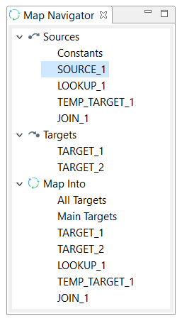 The Map Navigator lists all the constants, sources, targets, temporary targets, and lookups that are defined in the current map. It is displayed by default. If it is not displayed, go to View > Show View > Other, click Map Navigator and click Open.