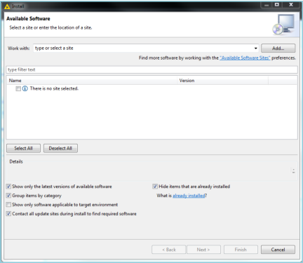 2. In the Install dialog, click Add to install locally or click Available Software Sites link to select the repository and upgrade remotely.