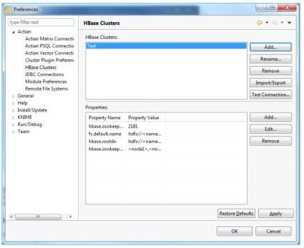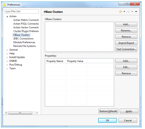 To add a new property, click Add in the Properties section of the HBase Clusters dialog.