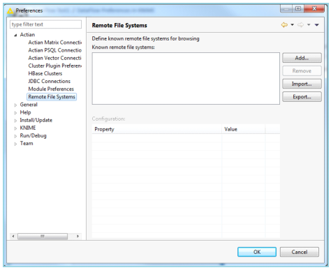 To access the page, go to File > Preferences. In the Preferences dialog, expand Actian and click Remote File Systems, which provides the currently configured remote file systems.