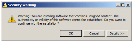 The progress of the installation is displayed in a dialog. If a Security Warning dialog appears, saying that the Actian software is not signed, you are installing from a recognized site, and it is safe to continue. Click OK.
