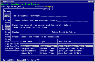 When you copy an existing frame definition, Vision uses the tables and all visual query specifications for the existing frame. This includes any escape code that you have written for the frame, as described in Using Vision Advanced Features.