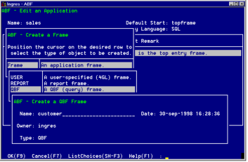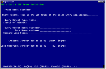 You are now back in the Edit an Application frame, where you can go on to create the rest of the frames for the sample application. Next, create the Customer frame, the QBF frame in the application.