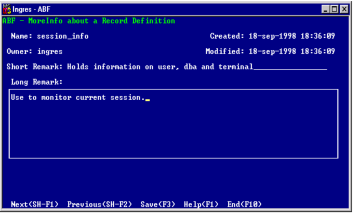 You can display or enter more information about any record type that appears in the Edit Application Record Type Definitions frame. To see this frame, highlight the record type name, enter the menu line, and select the MoreInfo operation. An example appears in the following figure: