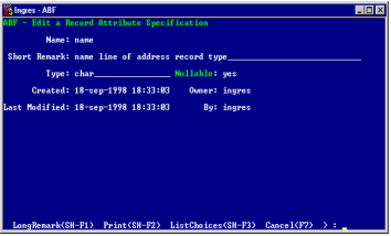 After you create a record attribute, you see the Edit a Record Attribute Specification frame, as shown in the previous figure. The Name field shows the attribute name you entered in the Create a Record Attribute frame.