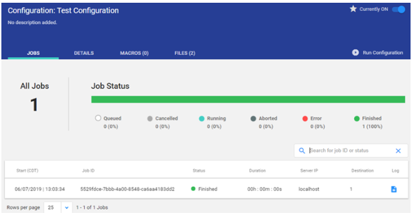 To check the configuration log, click the icon at the far right on the line, under the Log column. This displays metrics about the job and the generated log file.