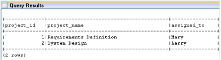 Results are displayed in the Query Results portlet. (Two records were added to the table.)