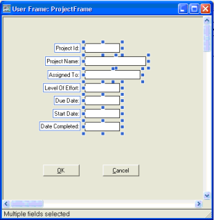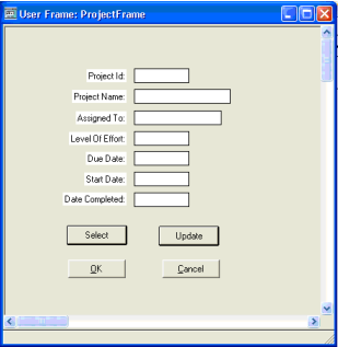 In this procedure, you will create a user frame in the ProjectApp1 application that will interact with the project table in your database. First, you create the user frame. Then you add the fields from the project table. Finally, you add the controls to the frame that will enable your application to update the project information in the database table.