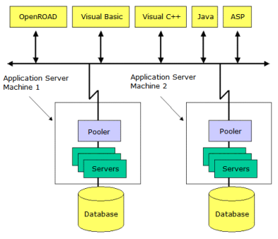 The OpenROAD Server is an object-relational application server—a powerful, object-oriented environment that equips you to build and deploy robust business objects in a number of environments. The OpenROAD Server is a collection of objects and services that support n‑tiered applications written in the OpenROAD 4GL language. OpenROAD Server facilities allow 4GL business logic to be shared by a wide variety of client programming environments and languages, including web server scripting languages, as shown in the following illustration: