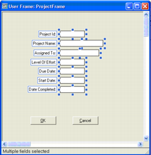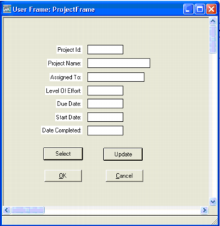 In this procedure, you will create a user frame in the ProjectApp1 application that will interact with the project table in your database. First, you create the user frame. Then you add the fields from the project table. Finally, you add the controls to the frame that will enable your application to update the project information in the database table.