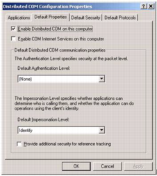 1. Using dcomcnfg, change the Default Authentication to (None) under the Default Properties of the Distributed COM Configuration Properties. This may require the machine to be rebooted afterward.