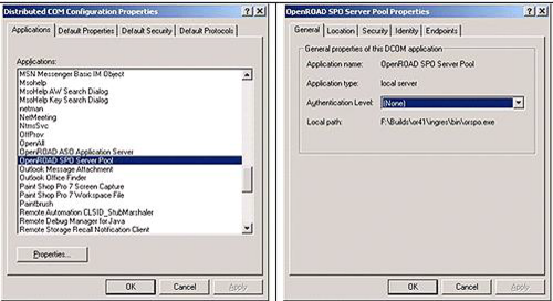 2. Using dcomcnfg, set the Authentication Level to (None) for the OpenROAD SPO Server Pool application (and for the OpenROAD ASO OpenROAD Server, although this is not as critical). This may require the machines to be rebooted afterward (both Windows and UNIX).